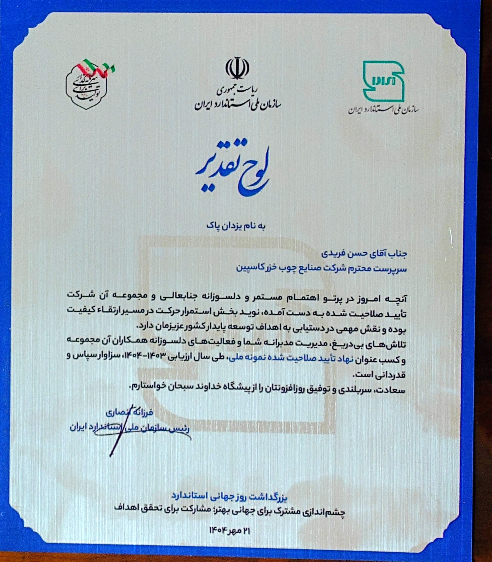 در مراسم گرامیداشت روز جهانی استاندارد که با حضور رئیسجمهور محترم، جمعی از وزرا، مدیران عالیرتبه دولتی و فعالان برتر صنعتی کشور در سالن اجلاس تهران برگزار شد، شرکت صنایع چوب خزر کاسپین بهعنوان یکی از شرکتهای نمونه کشوری در حوزه رعایت استانداردهای ملی و کیفیت معرفی و از سوی سازمان ملی استاندارد ایران مورد تقدیر قرار گرفت.