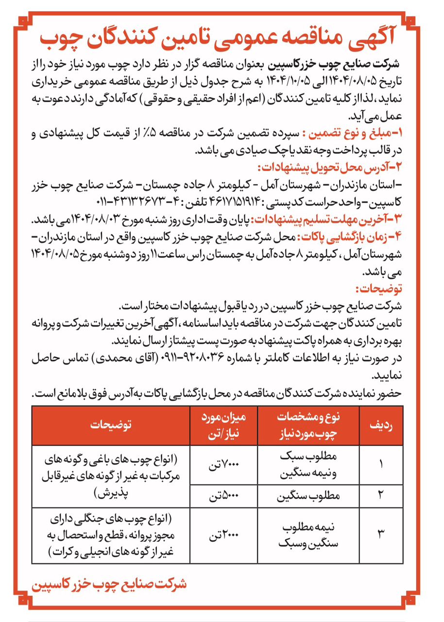 آگهی مناقصه عمومی تامین کنندگان مواد اولیه فوم رگولاتور و چوب