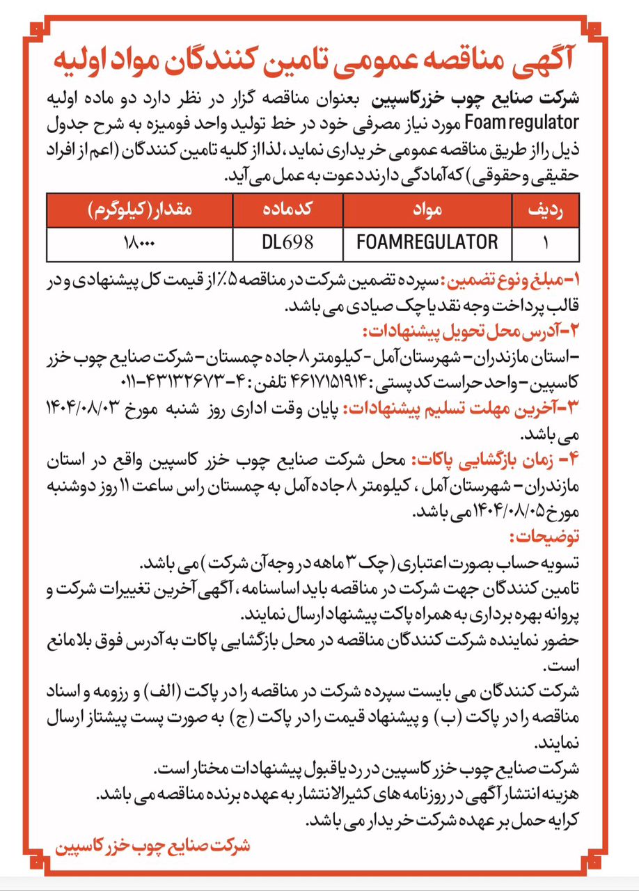آگهی مناقصه عمومی تامین کنندگان مواد اولیه فوم رگولاتور و چوب